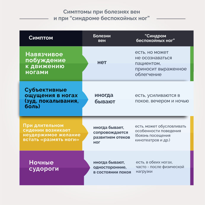 Если у таких людей и появляется боль, ее причины как правило, не связаны с венами. Чаще всего боли провоцируют сопутствующие заболевания, такие как остеохондроз пояснично-крестцового отдела позвоночника, деформирующий остеоартроз, плоскостопие, «синдром беспокойных ног» и т.п. Следует подчеркнуть, что именно боль часто служит основной причиной обращения человека к врачу. При этом сильная боль или выраженный дискомфорт в ногах чаще обусловлены неврологическими расстройствами. В частности, это может быть проявлением так называемого «синдрома беспокойных ног». Синдром беспокойных ног, известный в некоторых кругах как болезнь Виллиса-Экбома, не имеет никакого отношения к венам, а представляет собой в чистом виде неврологическое расстройство. Ведущим проявлением этого синдрома является непреодолимое желание совершить движение ногами, которое человек может не и осознавать или внутренне ему сопротивляться. И тогда основными жалобами становятся любые прочие ощущения пациента (зуд, покалывания, боль, судороги). Отличия симптомов при заболеваниях вен и синдрома беспокойных ног приведена на рисунке 4.