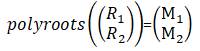 Затем вызывается или записывается вручную команда polyroots, в которую добавляется полученная матрица в виде: