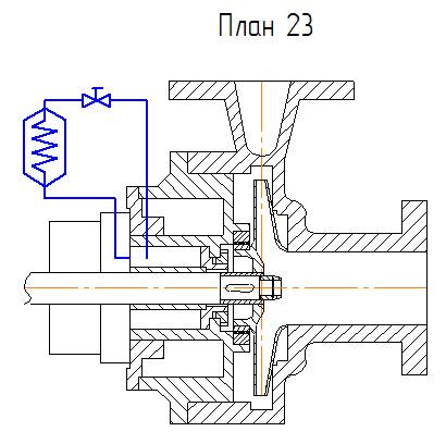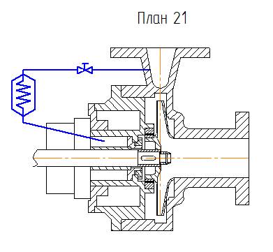 Одинарные торцовые уплотнения не комплектуются системой обвязки как таковой. В сальниковую камеру торцового уплотнения из нагнетательного патрубка насоса по трубопроводу подается жидкость для поддержания давления по плану 21, и с обеспечением циркуляции импеллером по схемам планов из ГОСТ 32600: