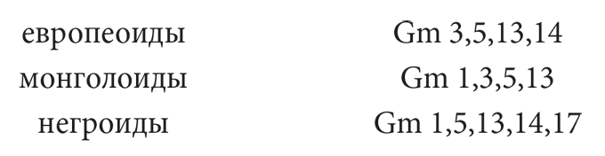Уникальность генетической системы Gm заключается в том, что каждая из крупнейших рас обладает характерным, свойственным лишь ей генным комплексом Gm, причем такие маркирующие гаплотипы представлены максимальными значениями частот».