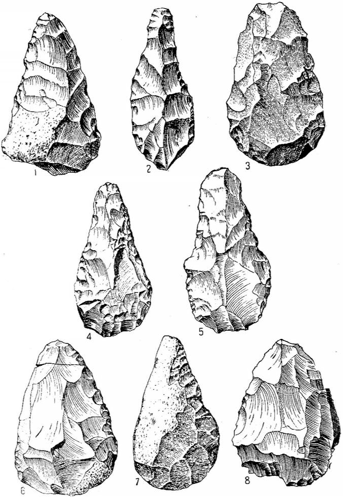 На протяжении многих тысячелетий своей начальной истории люди не знали употребления металлов. Основным материалом для изготовления первых орудий труда служил камень, и именно с обработкой камня связаны первые великие открытия в истории человечества. Не из каждого камня можно сделать хорошее орудие труда. Самые ранние были изготовлены из гальки, значительно позже человек освоил другую разновидность камней – кремни. Берега морей, русла рек, особенно русла горных потоков, богаты галькой разных размеров, форм, цветов и пород. Обкатанная форма этих камней очень удобна для захвата их рукой. Поэтому именно овальные уплощенные гальки послужили древнему человеку материалом для изготовления его первого рабочего инструмента – ручного рубила. Для работы требовалось два камня: один (более мягкий) служил заготовкой, а другой (из более твердых пород) – для нанесения ударов. Оббивка начиналась с узкого конца. После первого удара на поверхности заготовки образовывалось углубление в виде раковины. Оно служило как бы ударной площадкой для дальнейшей обработки. Мастер продолжал оббивать грани скола то с одной, то с другой стороны камня. С каждым новым ударом возрастало число ударных площадок, и заготовка постепенно принимала необходимую форму.