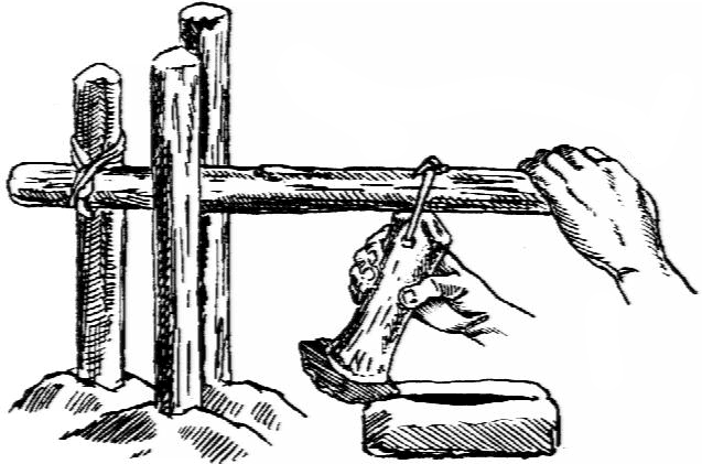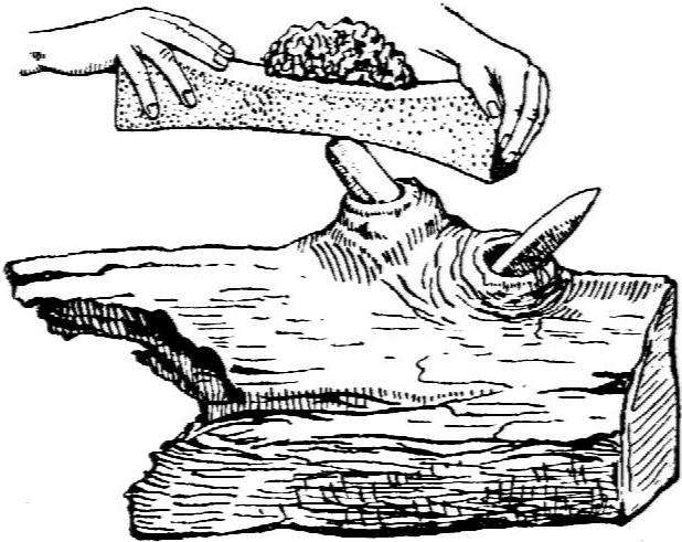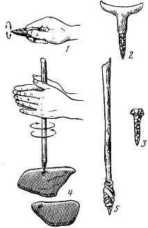 Одновременно с пилением развивалась техника сверления камня. Этот прием был очень важным при изготовлении составных инструментов. Люди давно заметили, что самые удобные и прочные топоры получаются тогда, когда рукоятка плотно забивается в отверстие самого топора, а не привязывается к нему. Но как сделать правильное отверстие в твердом камне? Ответ на этот важный вопрос был многие тысячелетия скрыт от человека. Как и в случае с пилением древние мастера освоили сначала сверление мягких материалов. В древнейшие времена, когда человеку нужно было сделать отверстие в дереве или кости, он прибегал к выбиванию. По крайней мере, именно таким способом еще недавно делали отверстия некоторые примитивные народы. Возможно, что именно при этой операции, вращая в отверстии каменный пробойник, древний мастер обнаружил, что высверливание требует гораздо меньше усилий. Сверление имело еще и то важное преимущество, что позволяло делать отверстие в твердых и хрупких материалах. Первое сверло, по-видимому, представляло собой обыкновенную палку, к концу которой было приделано каменное острие. Мастер просто катал ее между ладоней.