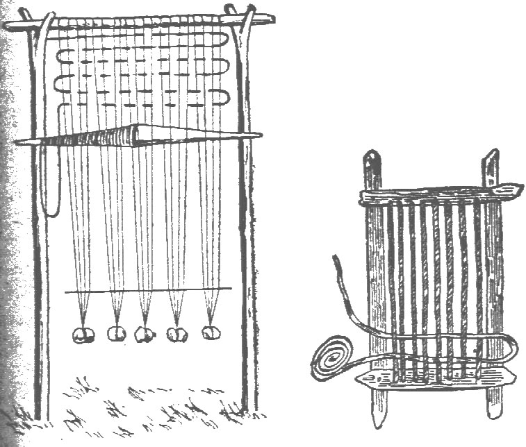 После получения пряжи мастер приступал к тканью. Первые ткацкие станки были вертикальными. Они представляли собой два вилообразно расщепленных вставленных в землю бруска, на вилообразные концы которых поперечно укладывался деревянный стержень. К этой поперечине, помещавшейся настолько высоко, чтоб можно было стоя доставать до нее, привязывали одну возле другой нити, составлявшие основу. Нижние концы этих нитей свободно свисали почти до земли. Чтобы они не спутывались, их натягивали подвесами. Начиная работу ткачиха брала в руку уток с привязанной к нему ниткой (в качестве утка могло служить веретено) и пропускала его сквозь основу таким образом, чтобы одна висящая нить оставалась по одну сторону утка, а другая – по другую. Поперечная нитка, например, могла проходить, то поверх первой, третьей, пятой и т. д. и под низом второй, четвертой, шестой и т. д. нитей основы, то наоборот. Такой способ тканья буквально повторял технику плетения и требовал очень много времени для пропускания нити утка то поверх. То под низ соответствующей нити основы. Для каждой из этих нитей необходимо было особое движение. Если в основе было сто нитей, то нужно было сделать сто движений для продевания утка только в одном ряду. Вскоре древние мастера заметили, что технику тканья можно упростить.