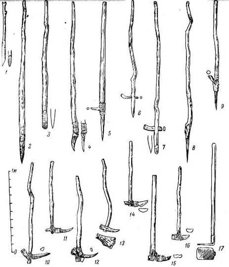 С древнейших времен одним из основных занятий человека было собирательство. Под этим словом современные ученые подразумевают сбор съедобных семян, орехов, фруктов, корней, личинок, яиц и т. п. Основным орудием при собирательстве была толстая палка-копалка, один конец которой был заострен и обожжен на огне для прочности. Но уже в очень древние времена наряду с ней стала употребляться палка с поперечным сучком, более удобная для копания земли. В этом орудии уже можно видеть прообраз мотыги. Позже рабочую часть такой палки стали делать из рога или кости. Наконец появились каменные мотыги, насаженные на деревянную ручку. Этим орудием можно было вскапывать землю, переворачивать ее и разбивать комья. Когда люди перешли к культурному возделыванию растений, мотыга на протяжении нескольких тысячелетий оставалась главным сельскохозяйственным инструментом земледельца.