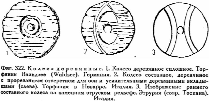 Первоначально сплошные колеса жестко скреплялись с осью и вращались вместе с ней. При качении по ровной дороге такие повозки были вполне пригодны для использования. Но на повороте, когда колеса должны вращаться с разной скоростью, это соединение создает большие неудобства, так как тяжело груженая повозка может легко сломаться или перевернуться. Сами колеса были еще очень несовершенны. Их делали из цельного куска дерева. Поэтому повозки были тяжелыми и неповоротливыми. Передвигались они медленно и обычно в них запрягали неторопливых, но могучих волов. Одна из древнейших повозок описываемой конструкции найдена при раскопках в Мохенджо-Даро.