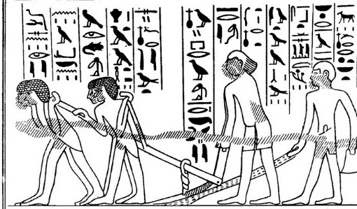 Дальнейшее усовершенствование "бороздовых палок" можно наблюдать в одном древне-ассирийском памятнике. Это был уже в полном смысле плуг, имевший все три его основные части: дышло, лемех и рукоятку. В такой форме он требовал двух работников: один тащил плуг, а другой направлял его и держал в земле. Все первые плуги приводились в движение силой человека. Разумеется, крестьянина тяготила такая работа и, спустя некоторое время, он стал запрягать в плуг быков. Поначалу люди просто привязывали плуг к рогам волов, позже появились ярмо и примитивная упряжь. Скорость обработки земли сразу возросла в несколько раз, а сама работа облегчилась.