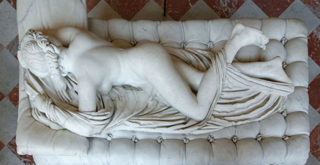 Тело молодого андрогина, покоящееся на матрасе, изваянном Джан Лоренцо Бернини по распоряжению кардинала, описывает мягкую извилистую линию: лицо повернуто направо, ноги налево, ступни направо, а простыня смята налево. С первого взгляда может показаться, что андрогин лежит в совершенно естественной позе, однако в действительности он сознательно соблазняет тех, кто бросает на него взгляд. Гермафродит – это самое томное существо из всех, когда-либо изваянных из мрамора. Тем не менее в данном случае он находится во власти желания, навеянного эротическими сновидениями, о чем свидетельствует его пенис, пребывающий в состоянии эрекции.