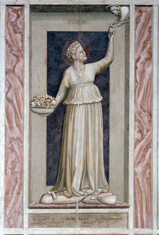 Следуя за добродетелями, зритель движется вдоль ряда блаженных, представленных с правой стороны от «Страшного суда», на стене, завершающей цикл. Жизнь во грехе, напротив, ведет прямой дорогой в ад. Верующий, проходящий по центру капеллы между двумя стенами, на которых изображены аллегории грехов и добродетелей, призван найти срединный путь между двумя крайностями и поддерживать экзистенциальное равновесие. К изображениям, на которых сравнение между эмоциями выглядит наиболее ярко, четко и ясно, относятся аллегории Милосердия и Зависти, расположенные одна напротив другой. Это два противоположных выражения желания: одно из которых, по словам Фомы Аквинского, имеет целью благо другого, а другое – способствует гибели первого. Это два страстных желания, пробуждающие противоположные силы и обитающие в столь же различных телах. По этой причине Милосердие (рис. 6), служащее синонимом любви и великодушия, является самой прекрасной из всех добродетелей.