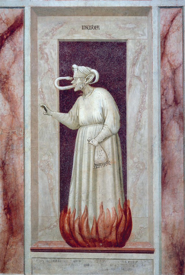 Здесь Джотто выражает своё полнейшее презрение, прибегая к целому ряду обозначений, которые уже давно были приняты в средневековой иконографии. Зависть – самый дьявольский и омерзительный из всех грехов. Ноги фигуры охвачены пылающим пламенем, пожирающим ее; безумное желание обладания заставляет аллегорическую фигуру крепко сжимать в руке мешочек с монетами, в то время как пальцы правой руки, жадно вытянутой вперед, скрючены, подобно когтям хищника. Отвратительная змея обвивает голову, хвост торчит из затылка, в то время как голова рептилии высовывается изо рта, угрожая ужалить ее в глаза и отравить ей взгляд. В буквальном переводе итальянское слово «зависть»[21] означает «слепота». Если ее глаза плотно закрыты, то уши, напротив, кажутся огромными, готовыми злорадно подслушивать любые сплетни и затем распространять их.