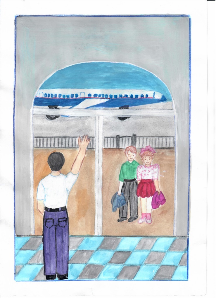 В окне фрунзенского аэропорта Шурик увидел машущего руками дядю Колю. Обрадовавшись благополучной встрече, мужчина крепко обнял детей, взял у Шурика чемодан и провёл своих гостей к креслам в зале ожидания. До прибытия автобуса битых три часа. Спешить было некуда. И, чтобы скоротать время, дядя Коля стал расспрашивать Лизу и Шурика о родителях, школе и самостоятельном перелёте. Они с тётей Таней очень беспокоились о том, как дети доберутся на самолёте. Ведь им всего-то 9 и 11 лет.