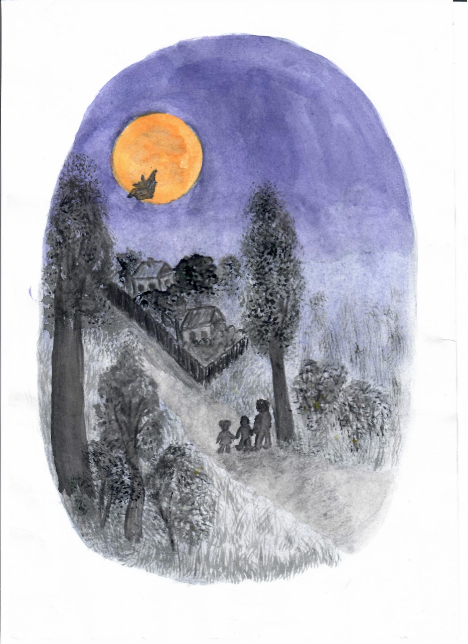 Они вышли из леса и направились домой. Путь освещала огромная и яркая луна. Она томно улыбалась им вслед. Ночь была тёплая и уютная. От неё веяло ароматом сухих трав и цветов. Как всегда, пели сверчки, и шарканье шагов гулко раздавалось в ночной тиши.