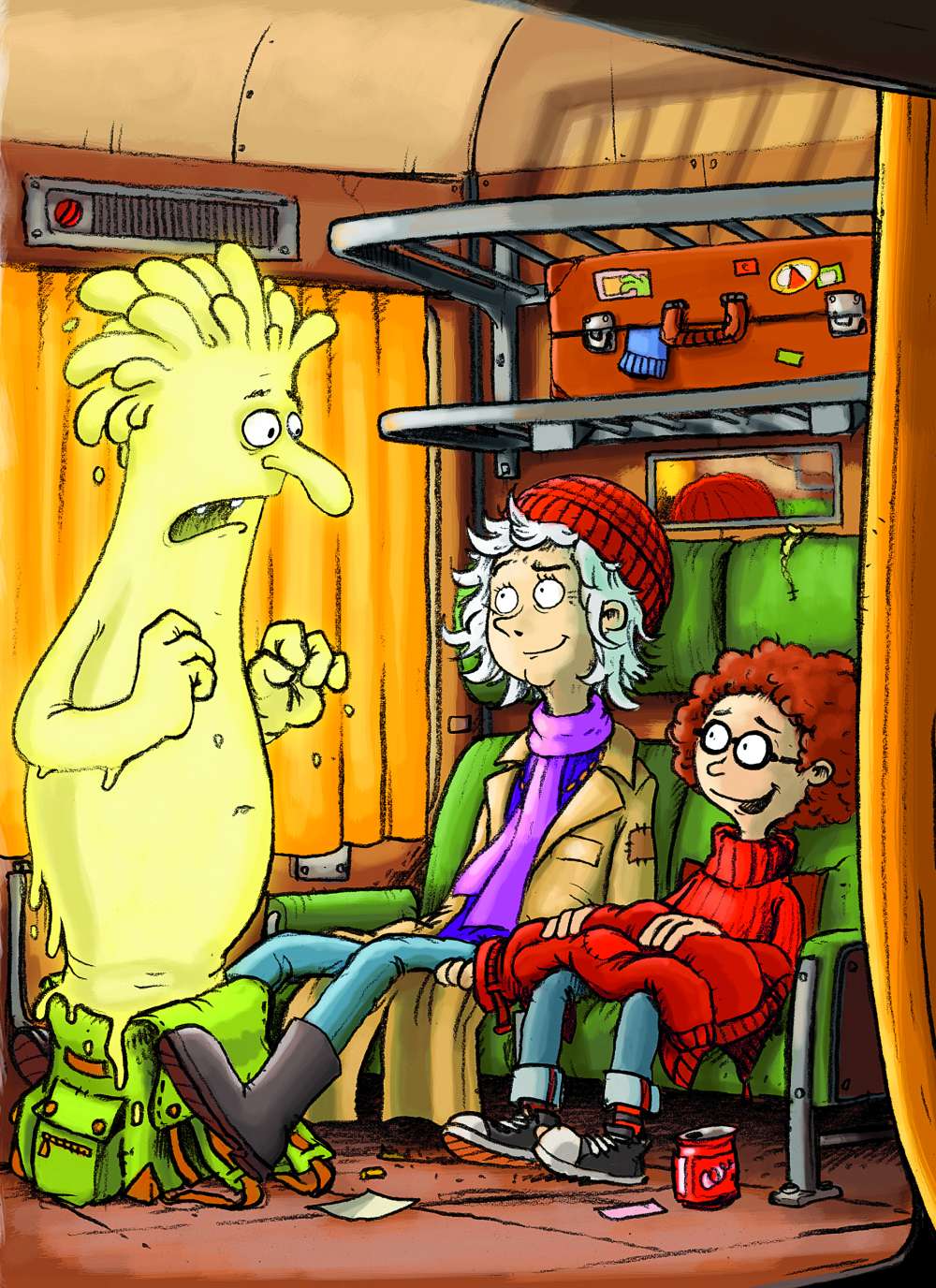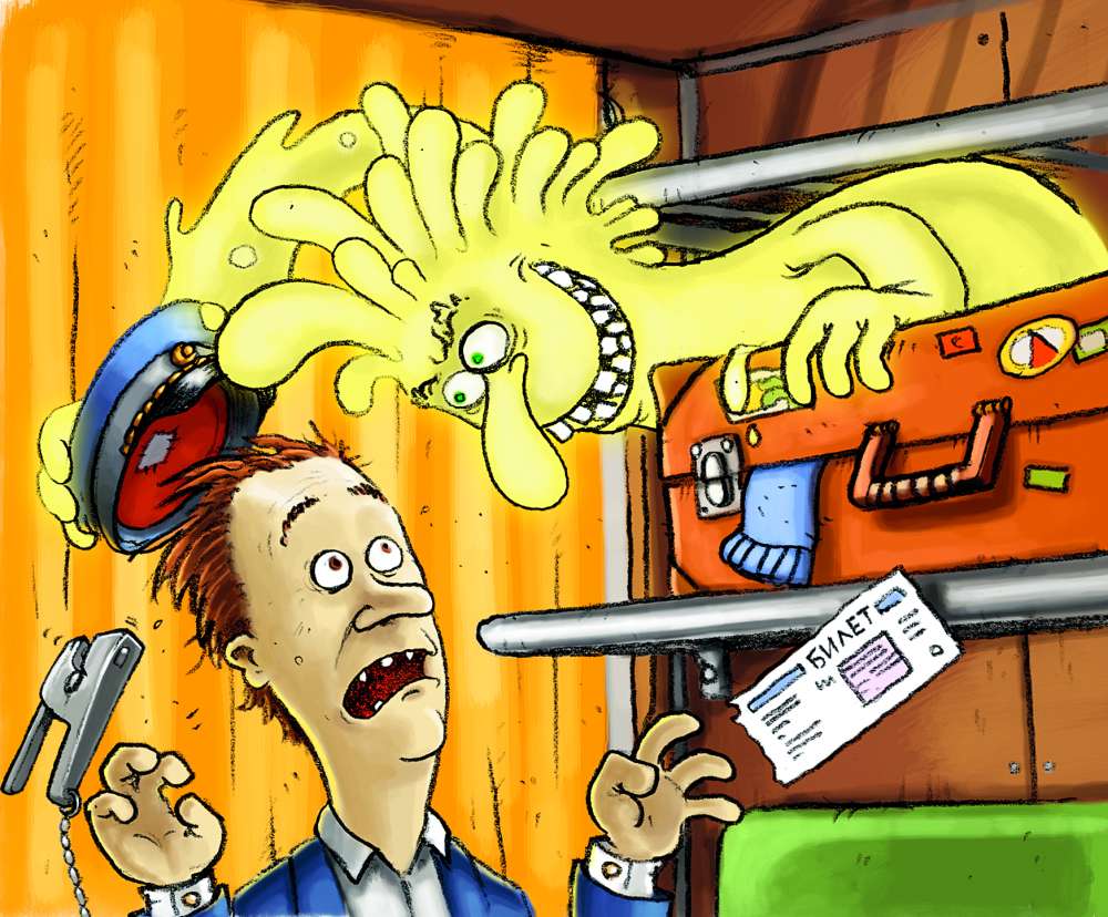 Проводник пробил билеты дыроколом, вернул их госпоже Кюммельзафт, и, кивнув, уже хотел покинуть купе, но что-то сдёрнуло у него с головы форменную фуражку. Что-то студенисто-холодное, зеленовато-заплесневелого цвета. Проводник испуганно глянул вверх, увидел свою фуражку, зависшую сантиметрах в десяти над его головой, а ещё выше заметил привидение с растрёпанными патлами и ядовито-зелёными глазами, которое злобно таращилось на него сверху.