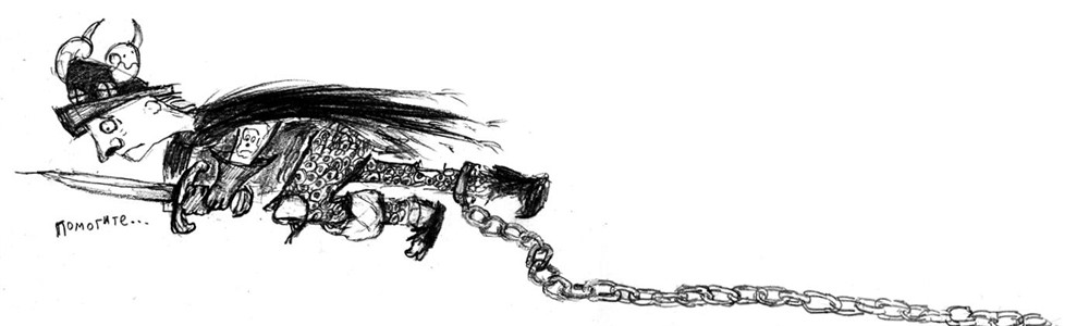 Сморкалу, по-прежнему прикованного к Урагану длинной цепью, потащило следом, непрестанно колошматя о камни.