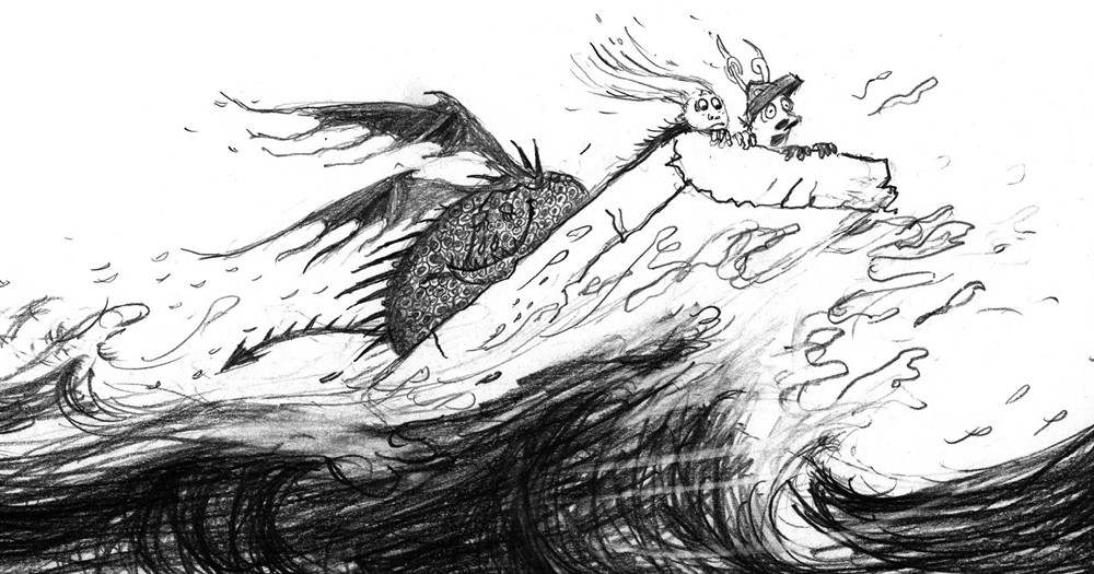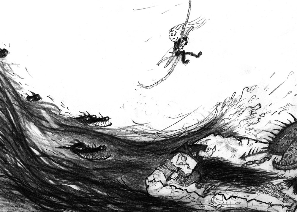 Невидимо спикировав вниз на спине Смертеня, Иккинг выхватил Мухрюнделя из воздуха, сунул в заплечный мешок и тут же взмыл вверх снова.