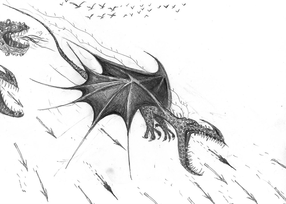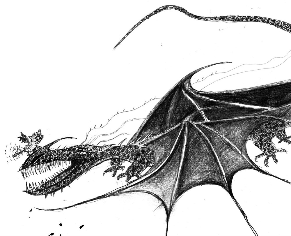 Далеко-далеко на севере изо льда и огня, из булькающих вулканических озер вздымался темный силуэт. Невообразимо огромный, он заслонял собой луну. Каждым взмахом громадных темных крыльев дракон преодолевал огромное расстояние с немыслимой быстротой. Тень направлялась на юг, прямо к беглецам в Душегубских горах. Глаза ее сочились пламенем, а огромная пасть изрыгала смерть, муки и невыразимые ужасы.