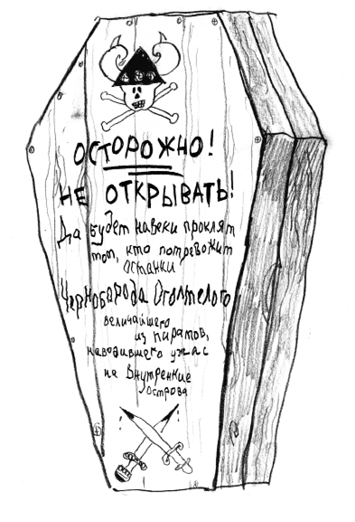 – А я вот что скажу, – влез Старый Сморчок, самый мудрый и самый древний Старейшина племени Лохматых Хулиганов. – На крышке этого гроба ясно написано: «НЕ ОТКРЫВАТЬ! Да будет навеки проклят тот, кто потревожит останки Черноборода Оголтелого, величайшего из пиратов, наводившего ужас на Внутренние острова». И весь мой немалый опыт говорит, что НЕ СТОИТ ОТКРЫВАТЬ гроб, на котором написано «НЕ ОТКРЫВАТЬ!».