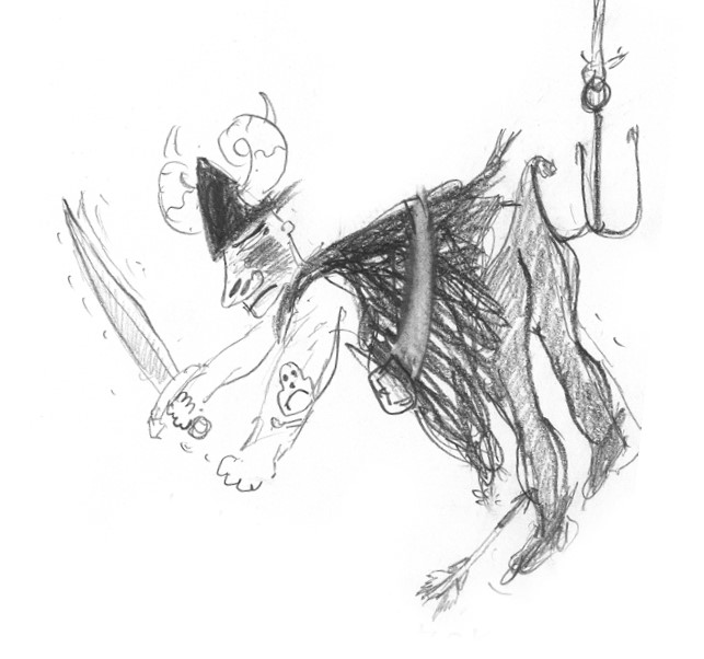Сморкала вытащил меч и изо всех сил постарался принять внушительный вид – непростая задачка для того, кто свисает, подцепленный крюком за пояс, без опоры под ногами и со стрелой в лодыжке.