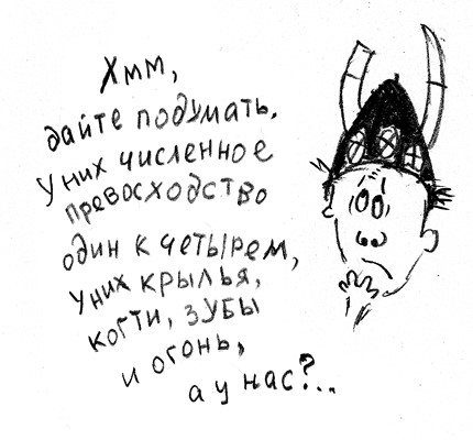 Взмыло вверх ужасное драконье войско, победно поливая огнем, визжа и распевая, оставив на скале оборванные и обожженные жертвы и готовое к новому приступу…