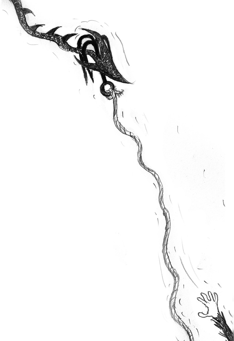 Отчаянно озираясь, он увидел рядом с собой на карнизе веревки и крючья, которыми они с Рыбьеногом пользовались во время подъема. Дрожащими руками Иккинг обвязал один конец вокруг скального выступа и свесил крепежный крюк через край карниза, словно вознамерился подцепить краба с причала.