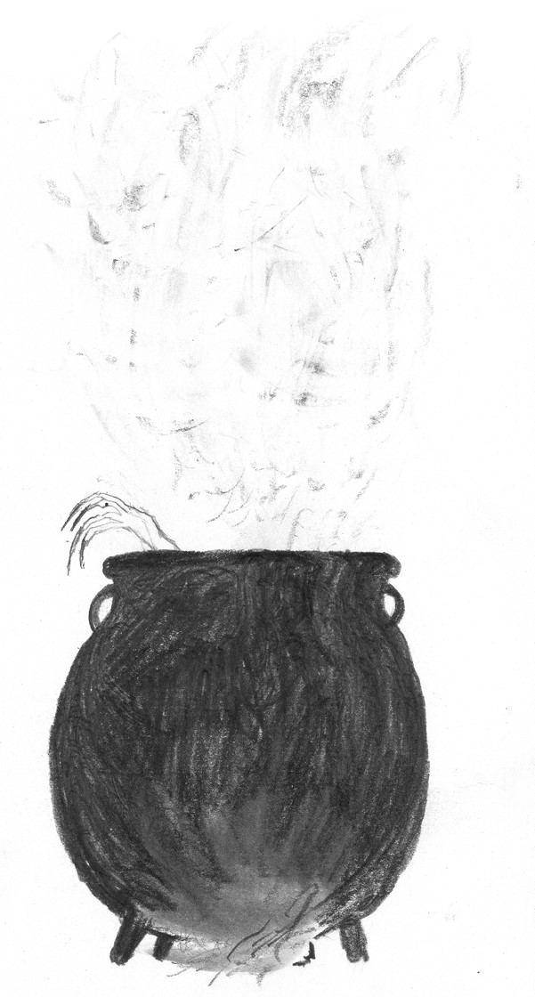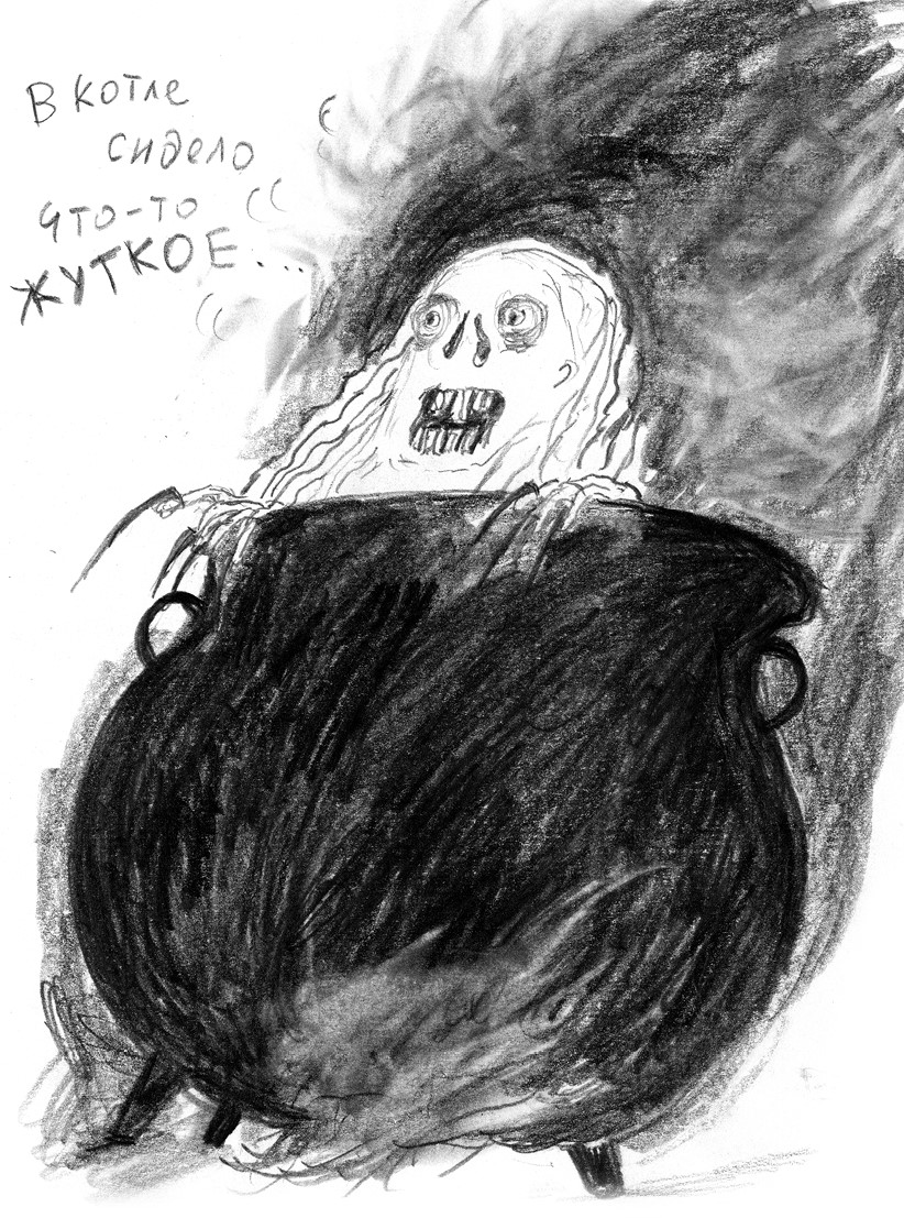 И медленно-медленно из кухонного котла показалась человеческая голова, бумажно-белая и ухмыляющаяся, словно череп. За головой появились плечи, потом грудь, и наконец все поняли: перед ними старуха с длинными белыми волосами, полуслепыми глазами, затянутыми толстой серой пленкой, и носом острым, как кончик ножа.