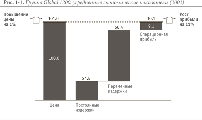 Несомненно, что ценообразование – самый важный рычаг, который может задействовать компания. На рис. 1-2 на основе усредненных показателей Global 1200 показано, как меняется операционная прибыль при изменении какого-либо из факторов на 1 %.