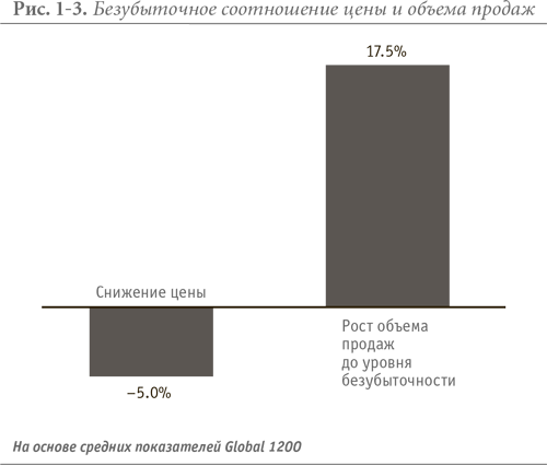 При экономических показателях, сходных со средними для Global 1200, снижение цены на 5 % потребует увеличения объема продаж на 17,5 %, и не для увеличения операционной прибыли, а просто чтобы добиться безубыточности. Такое увеличение объема продаж маловероятно. Потому что снижение цены на 5 % ради увеличения объема на 17,5 % потребует ценовой эластичности –3,5:1. То есть снижение цены на 1 % должно вызывать рост объема продаж на 3,5 %. Наш опыт работы на реальных рынках показывает, что максимальное значение ценовой эластичности обычно составляет только –1,7:1 или –1,8:1. В редких случаях – обычно это потребительские товары, приобретаемые под влиянием момента («импульсные» покупки), – эластичность может достигать –2,5:1. В реальном мире ценовая эластичность –3,5:1 крайне редка. Поэтому простая арифметика снижения цены для увеличения объема продаж ради роста прибыли не срабатывает. Обратите внимание на то, что вам нужно делать этот расчет с использованием показателей собственного бизнеса, чтобы проверить, как соотношение цены, объема и прибыли будет работать в ваших условиях.