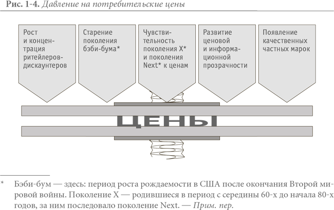 Цены на потребительских рынках находятся под давлением сочетания фундаментальных изменений в бизнесе и демографических сдвигов (см. рис. 1-4). Ритейлеры-дискаунтеры, например Wal-Mart, Home Depot и Costco, укрупняются, в отрасли все больше растет концентрация. Эти гиганты пользуются своей рыночной силой и добиваются все более низких цен от поставщиков потребительских товаров. Развитие Интернета, а также все более широкое применение этими дискаунтерами рекламы цен, облегчает покупателям поиск и сравнение цен на потребительские товары. Тем временем повышается качество фасованных товаров, обычно продаваемых под брендом розничной сети, что усиливает давление на традиционные бренды во многих товарных категориях.