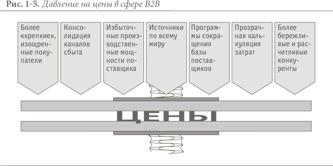 Компании в сфере B2B (business-to-business) также ощущают давление на цены, оказываемое изменениями на рынке (см. рис. 1-5). Покупатели стали настойчивее, накопили опыт максимально возможного снижения цен поставщиками. В 90-е годы программы эффективности позволили развернуть избыточные мощности на многих рынках. Программы сокращения базы поставщиков переводят большой объем закупок на уменьшающееся число поставщиков, поэтому поднимаются ставки и растет сила клиентов на переговорах. Стала более привычной прозрачная калькуляция затрат, когда сильные покупатели настаивают на том, чтобы знать о подробностях издержек по каждому компоненту продукта, включая затраты на материалы, прямые затраты на рабочую силу и накладные расходы. С таким знанием издержек поставщика покупатели обладают преимуществом на переговорах о цене.