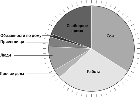Но если принять в расчет наши многочисленные обязательства, времени остается не так уж много: если быть точным, каких-то два с половиной часа в день. Чтобы стало еще очевиднее, как мало времени у нас остается для самих себя, я представил эти данные в виде диаграммы: