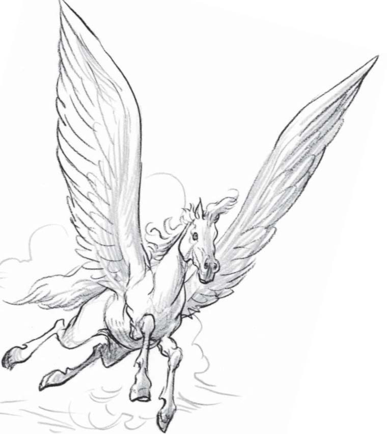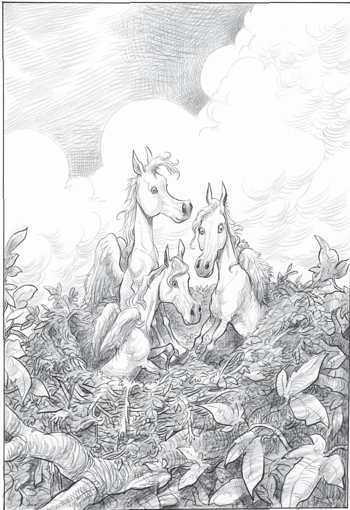 Вскоре на листья падает тень, потом ещё одна, и раздаётся свистящий звук: с неба спускаются две крылатые лошади. Под ними, на ветвях деревьев, уютно устроившись во мху, лежат три только что вылупившихся крошечных крылатых жеребёнка.