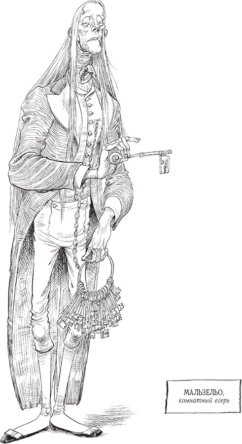 От Мальзельо исходил запах мокрых ковров и плесени, а в должности комнатного егеря он состоял в Грянул-Гром-Холле уже так давно, что никто не помнил, когда он появился. Его работа состояла в том, чтобы сгонять ворон, пытающихся усесться на украшенные изразцами печные трубы, не давать осам устраивать свои гнезда на чердаке, пестрым китайским оленям – жевать ковры, синехвостым тритонам – откладывать яйца в канализационных трубах. Для этого он использовал сети, порошки и ловушки всех размеров и фасонов.