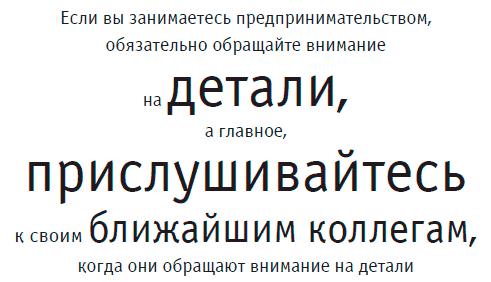 Скорее всего, это признак более существенной слабости – неспособности сосредоточиться. Я говорил, что предприниматели одержимы работой, и это действительно так. Вместе с тем они подчас неспособны сконцентрировать внимание на деталях в течение сколько-нибудь заметного времени. Они напоминают людей, которые, отгородившись от всего, что мы называем жизнью, безостановочно кружатся внутри своего маленького мирка со все большей скоростью. Если вы занимаетесь предпринимательством, обязательно обращайте внимание на детали, а главное, прислушивайтесь к своим ближайшим коллегам, когда они обращают внимание на детали.