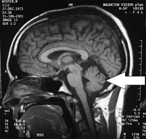 Все мои пациенты говорили, что внутри очень шумно, усиливается клаустрофобия и в целом чувствуешь себя некомфортно. Я был сильно разочарован. Что меня действительно впечатлило, так это размер моего мозжечка – до странного маленький. Следующим утром я прикрепил свой МРТ-снимок в читальном зале врачей-неврологов. У нас была такая традиция – прикреплять необычные снимки, чтобы другие врачи могли написать рядом с ними свои догадки и теории. Практически все, кто не заметил мое имя на снимках, написали «церебеллярная гипоплазия», то есть нехарактерно маленький мозжечок. Странно, но мой мозжечок (часть мозга, отвечающая за координацию мышц; на фото указан стрелкой) был немного маловат, как вы можете видеть. А большинство тех, кто все-таки увидел мое имя, предположило «атрофию яичек». Умники.