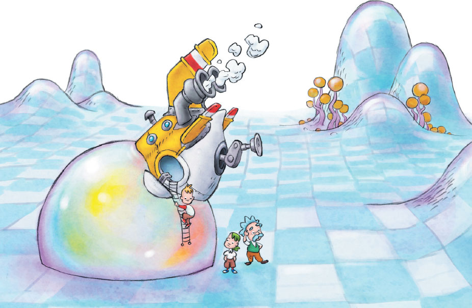 Путешественники осторожно спустились по лестнице и ступили на землю. Подул холодный влажный ветер, и туман забрался прямо под одежду. Дядя Альберт во все глаза смотрел на Лунник. Ракета наполовину застряла в каком-то огромном шаре. Причём видна была лишь верхушка шара, а остальное находилось под землёй. Но самое удивительное – шар совсем не пострадал. На ощупь его поверхность оказалась твёрдой и гладкой, почти как стекло. Шар переливался всевозможными цветами.