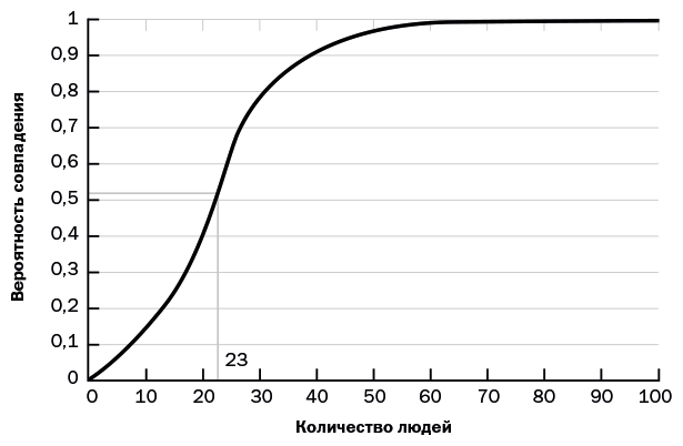 Парадокс состоит в том, что для 23 человек имеется 50-процентная (!) вероятность, что у двоих из них в случайной выборке день рождения в один и тот же день (поскольку есть 253 сочетания, или потенциальные пары)[22]. Еще поразительнее то, что уже для 70 человек существует вероятность, что двое из них практически наверняка родились в один день, – это будет в 99,9 % случаев. Как человеку, вынужденному остаться в школе на второй год из-за отсутствия способностей к математике, мне потребовалось некоторое время, чтобы это понять. Но это действительно так!