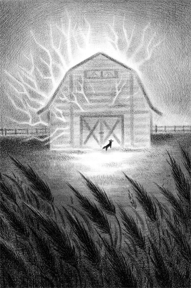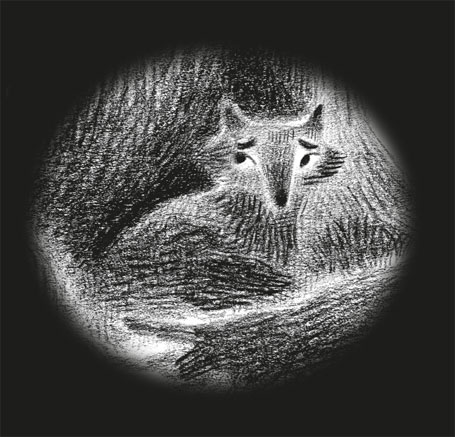 Ферма стояла погружённая в тёмную синеву, если не считать двух источников света. В хозяйском доме мерцал огонёк свечи, слабый и пленительный за кружевными шторами окна. А в норах из проволочной сетки, расставленных по двору, гудели ослепительно красные полосы, от которых лисий мех светился, как пламя.