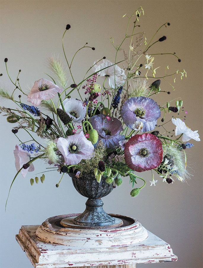 По аналогии с экологичным садоводством экологичный стиль во флористике подразумевает расслабленное художественное объединение в одной композиции растений, которые принадлежат к схожей среде обитания. Например, дикие маки успешно произрастают в нарушенном грунте (отсюда их печальная ассоциация с полями сражений первой мировой войны). Также они нередко мелькают среди трав по обочинам дорог. Отталкиваясь от этой малоплодородной среды обитания, я смешала мак Papaver rhoeas с вейником (Calamagrostis), трясункой (Briza) и пеннисетумом; добавила крошечную гипсофилу Kermesina, которая также рождается на каменистой, сухой земле; лаванду, еще одно засухоустойчивое растение; белые сокирки (Consolida White Cloud); эхинацею Green Wizard (еще один степной по происхождению вид) и несколько пучков диких трав.
