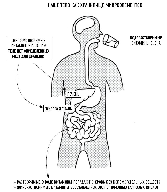 Углеводы хранятся в печени в виде гликогена, белки – в мышечной и соединительной ткани, а жиры – в жировой. Если наши хранилища переполнены этими макронутриентами, мы можем это легко увидеть: на весах и в зеркале. К сожалению, функция микронутриентов не так проста.