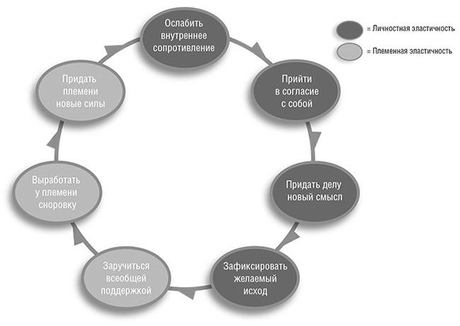 Успешно преодолев сопротивление переменам, мы можем наконец подступиться к происходящему во всеоружии согласия с собой, придать делу новый смысл, расширив самоидентификацию, и в конце концов прийти к дополнительным вариантам решения. Больший выбор позволит зафиксировать желаемый исход, заручиться общей поддержкой племени в его достижении, а в процессе выработать у всех и каждого сноровку и накопить новые силы, которые весьма пригодятся племени для решения будущих задач, возникающих по мере всё новых изменений.
