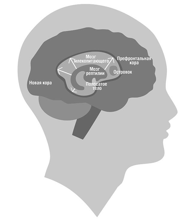 УПРАВЛЕНИЕ СОБСТВЕННЫМ СОЗНАНИЕМ: ЖИВОТНОЕ И РАЗУМНОЕ СОСТОЯНИЯНаш головной мозг можно считать состоящим из трех неотъемлемых частей, развившихся в процессе эволюции: мозга рептилии, мозга млекопитающего и коры больших полушарий. Эту модель «триединого мозга» нейробиолог Пол Маклин[6] предложил для упрощения понимания функций головного мозга человека, который в реальности, конечно, устроен намного сложнее3. Из своей врачебной практики Маклин сделал вывод, что человеческий мозг – это на самом деле три мозга в одном черепе (отсюда и термин «триединый»). Ему же принадлежит и термин лимбическая система: