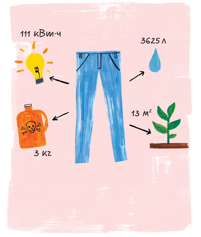 Производство одежды требует огромных объемов драгоценных природных ресурсов. Чтобы сшить одни джинсы, расходуется 3625 литров воды, 3 килограмма химических веществ, 111 киловатт-часов электроэнергии и 13 квадратных метров пахотной земли[12].