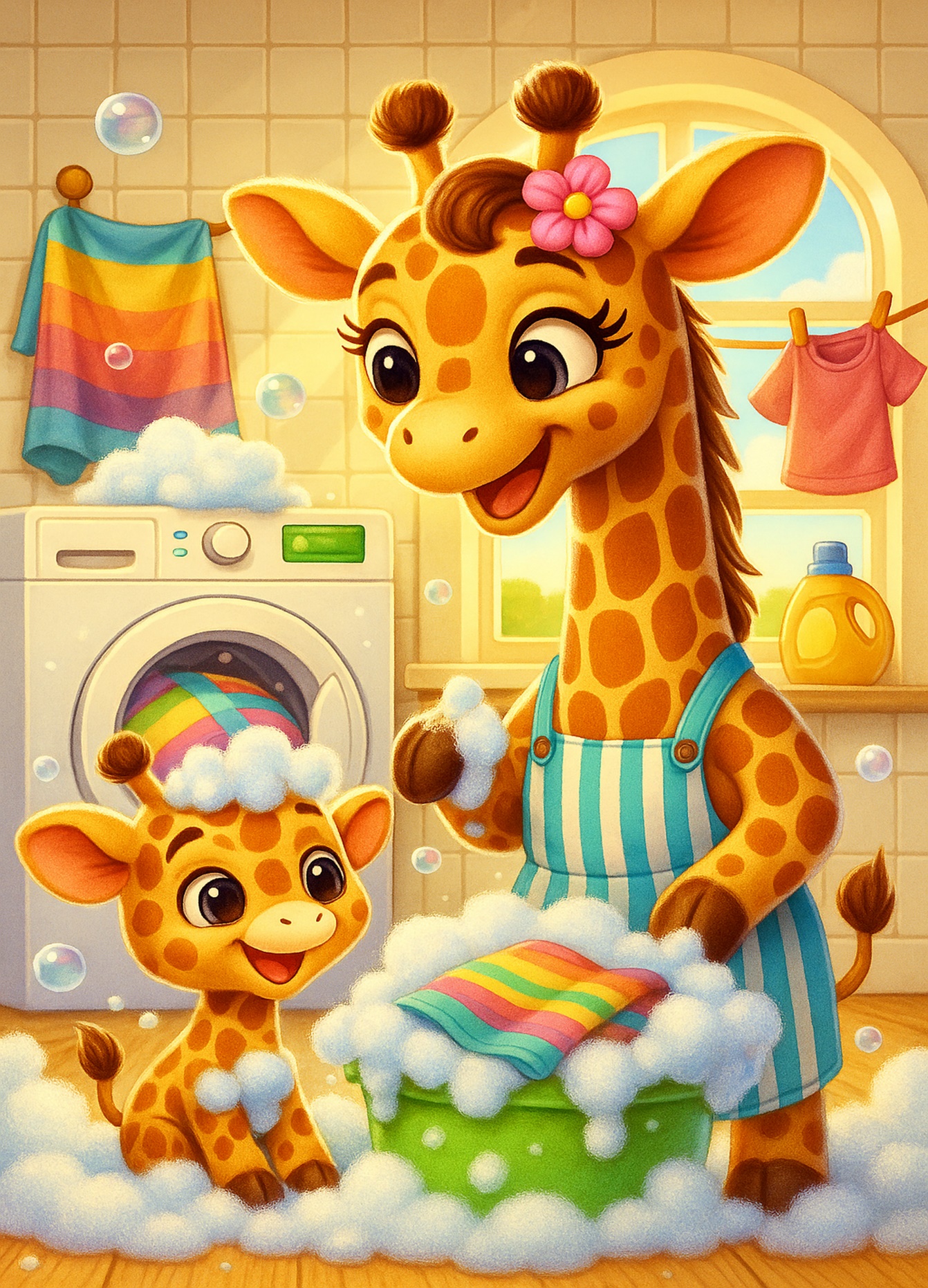 – Сегодня у нас будет важное задание, – сказала жирафа, стоя перед зеркалом. – Сегодня я стану самой настоящей хозяйкой и постираю ВСЁ бельё!