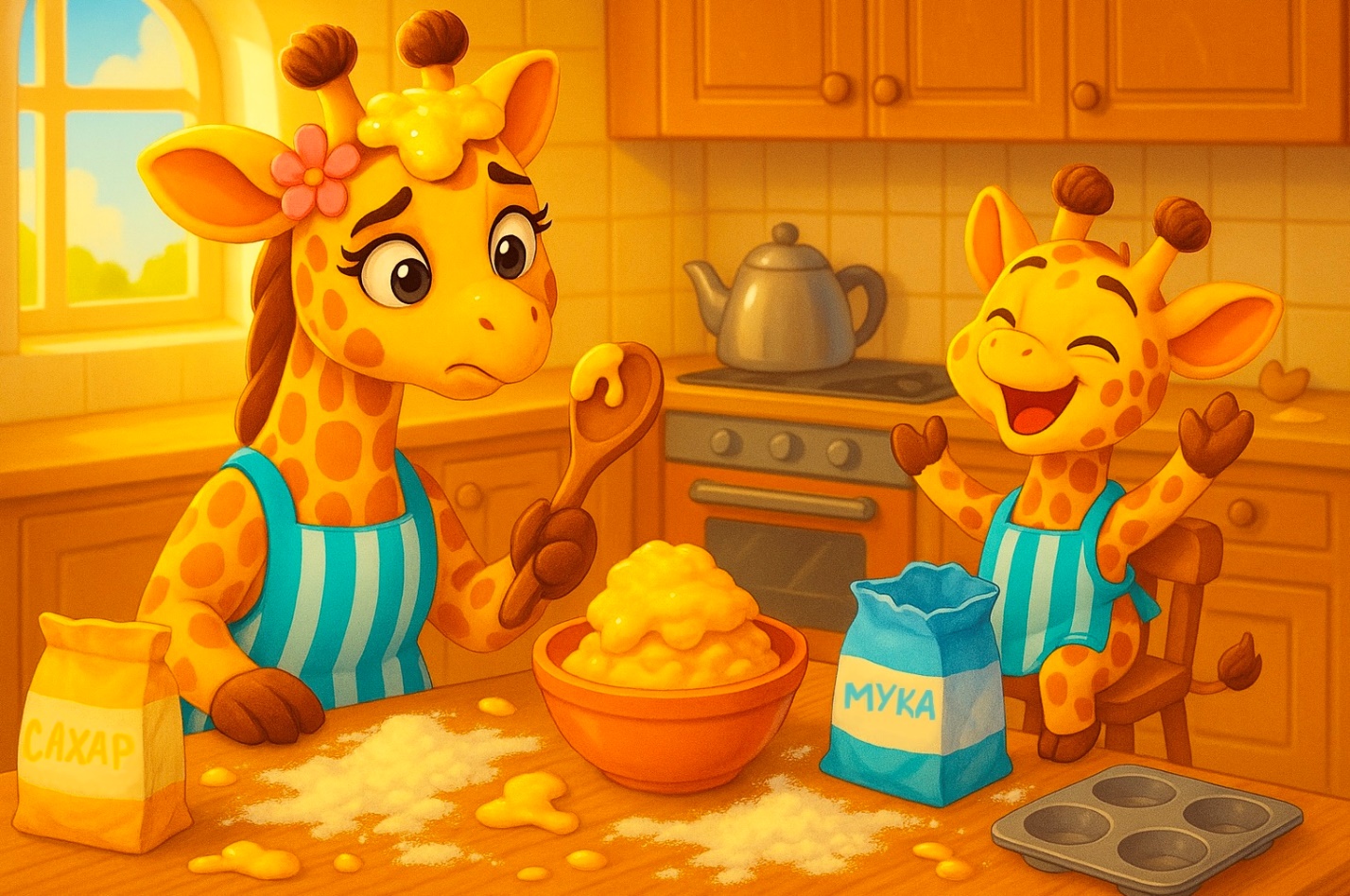 – Знаешь, – сказала жирафа, вытирая сахарную пудру с носа, – иногда что-то может пойти не по плану. Но это не значит, что всё испорчено. Иногда из самой большой ошибки получается самое лучшее приключение!