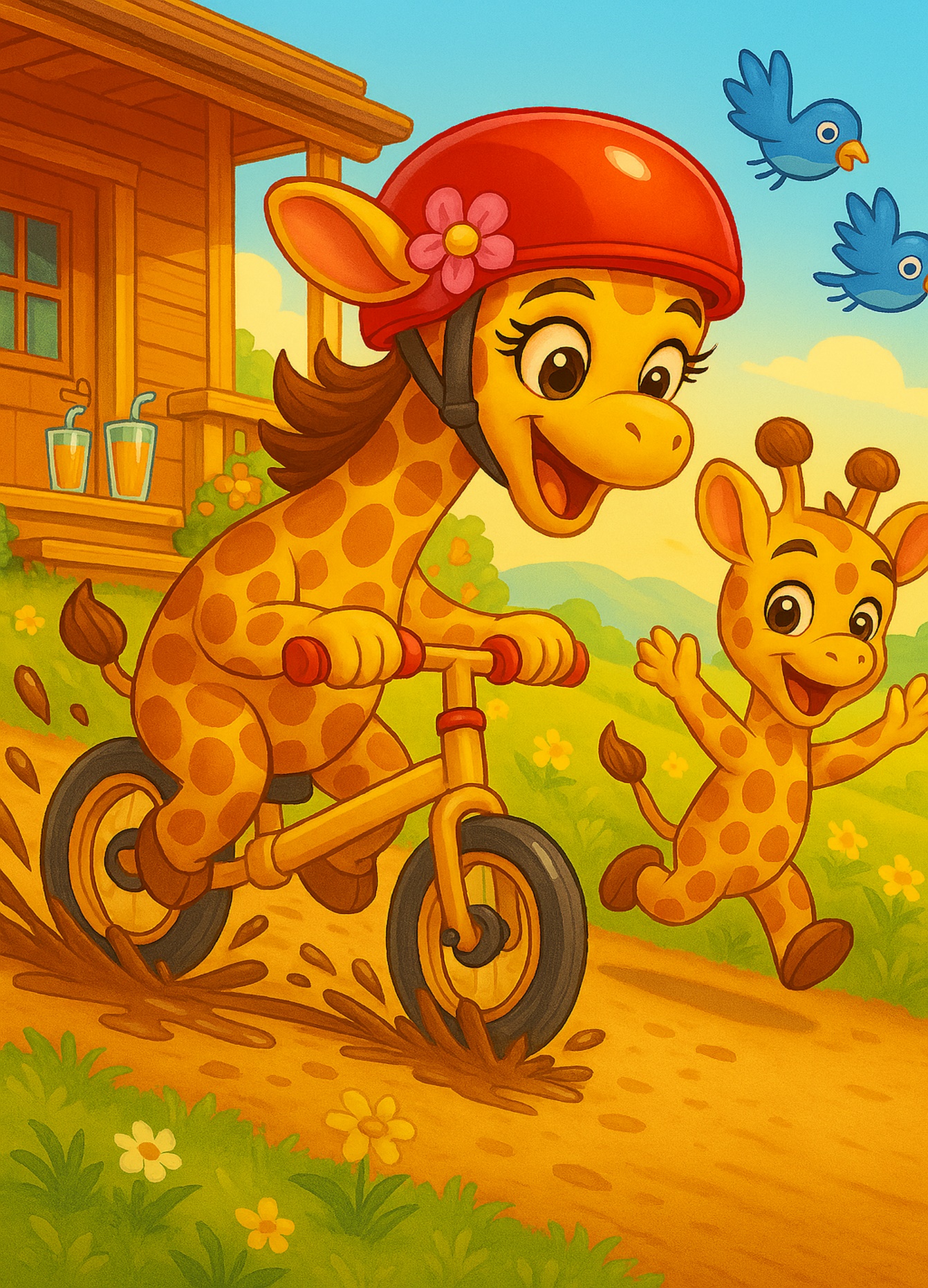 Беговел ехал всё быстрее. Жирафа едва успевала объезжать кочки и лужи, а мимо неё пролетали удивлённые птички.
