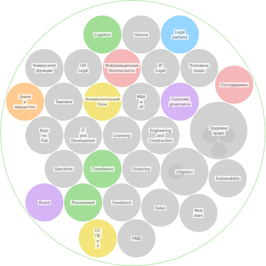 Юристы Корпоративного центра организованы в плоскую структуру, в которой нет организационно выделенных направлений или отделов, и все сотрудники имеют должности «юристов» либо «старших юристов». Юристы Корпоративного центра разделены на условно согласованные «Круги», нацеленные на управление юридической работой в отдельных специализированных направлениях. В Круг может входить от трех до десяти юристов. Некоторые юристы входят в несколько Кругов. У каждого Круга есть лидер, отвечающий за развитие соответствующего направления юридической практики. Набор Кругов, состав их участников периодически меняются, с учетом новых вызовов и обстоятельств. В момент написания книги юристы Корпоративного центра Сибура были объединены в следующие Круги: