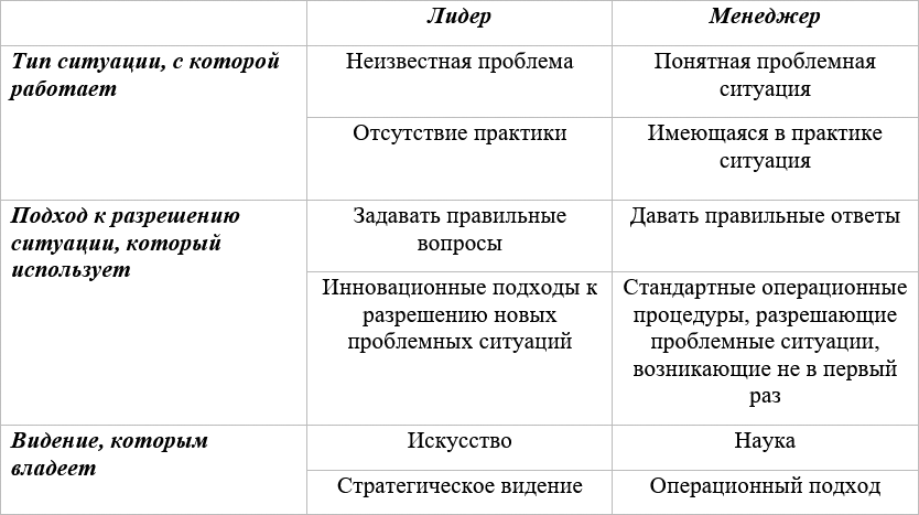 Лидерство – одна из наиболее сложных категорий в науке и практике управления. Как отмечают Джэксон и Пэрри (2018), лидерство – феномен, относительно которого у каждого есть мнение, но мало кто сходится в том, что оно из себя представляет[1]. С нашей точки зрения, одним из подходов, позволяющих наглядно проиллюстрировать основные характеристики лидерства, является сравнение лидера и менеджера, играющих совершенно разные управленческие роли. Гринт и Хольт (2011)[2] представили следующее наглядное сравнение этих дух ключевых управленческих ролей: