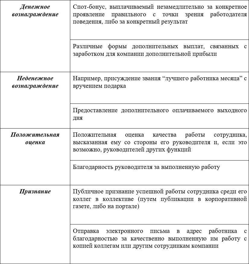 6. Умение давать обратную связьМотивация персонала базируется как на инструментах работы с их внутренними мотивами (включая предоставление достаточной автономии, уважение профессионализма сотрудника, предоставление ему информации о связи его работы со стратегией компании, создание поддерживающей мотивацию атмосферы), так и на внешних стимулах. К последним традиционно относятся поощрение и наказание. В своей уже упомянутой здесь книге Шломо Бен Гур выделяет следующие основные формы поощрения сотрудников:
