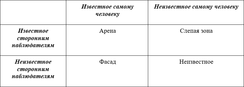 Обратная связь важна не только для поддержки или корректировки действий сотрудников, но и для их развития. Здесь уместно обратиться к модели, предложенной в 1955 году психологами Джзефом Луфтом и Харрингтоном Ингамом, “Окно Джохари” (“Johari window”). В соответствии с данной моделью, у человека есть четыре области понимания себя, как иллюстрирует таблица ниже: