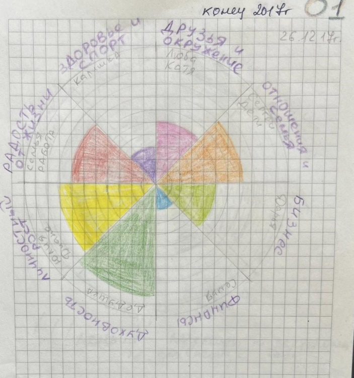 Я впервые нарисовала колесо баланса. Простая методика: 8 сфер жизни, каждую надо было оценить по десятибалльной шкале.