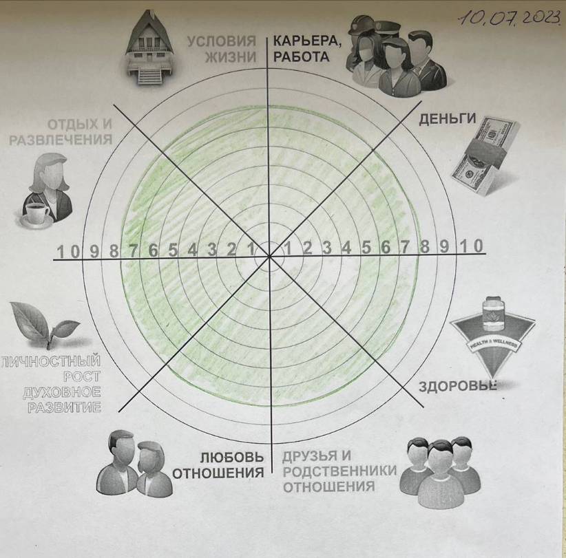 Когда я посмотрела на колесо баланса в июле 2023 года и увидела все сферы на 8 баллов, это было удивительное ощущение, как если бы я наконец-то нашла то, что долго искала.